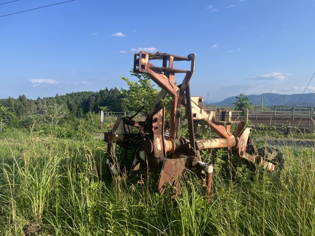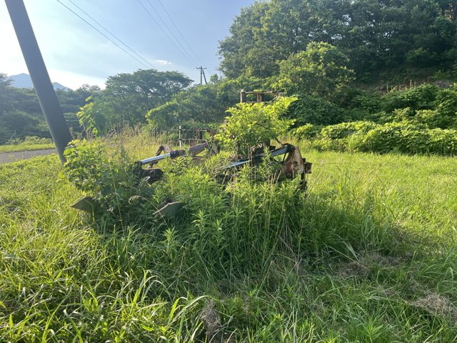 google map で散策中、山の上に怪しいプラウが鎮座しているのを発見した。 これは例のスイングプラウの残骸に間違いないと思い、2025年6月29日、山のてっぺん、S牧場入口付近の彼を訪問した。